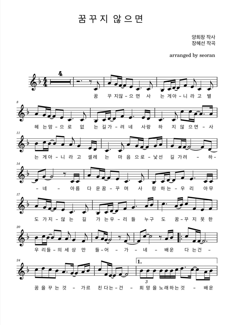 꿈꾸지 않으면 악보 (플루트,오카리나,노래 악보)